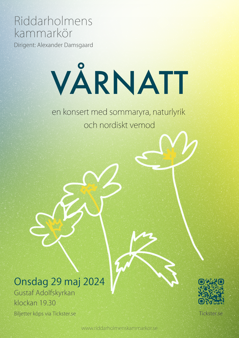 Välkomna till en traditionell försommarkonsert med Riddarholmens kammarkör. Vi bjuder på musikaliska örhängen från förra sekelskiftet, skapade av nationalromantiska kompositörer som Peterson-Berger, Stenhammar, Söderman och Wikander. Kom och fira sommaren med oss!